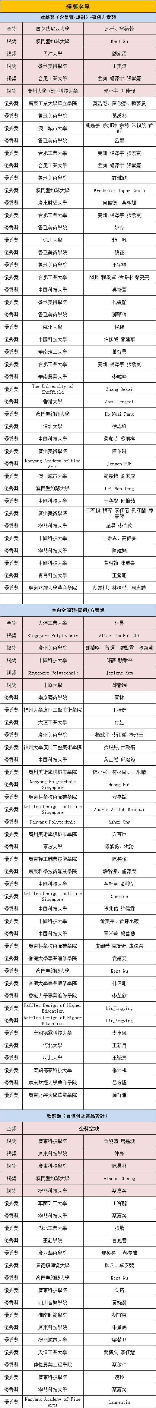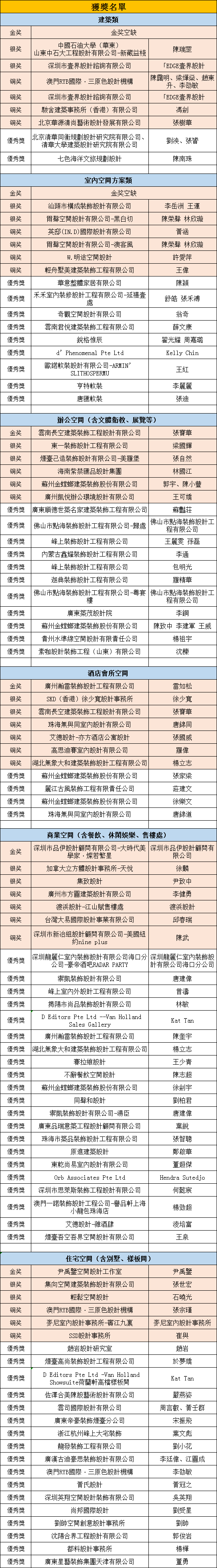 第六届澳門國際設計聯展(雙年展)頒獎典禮已於 12月18日在澳門美獅美高梅酒店落幕,眾多獲獎者載譽而歸。現公佈兩大賽事具體名次如下: