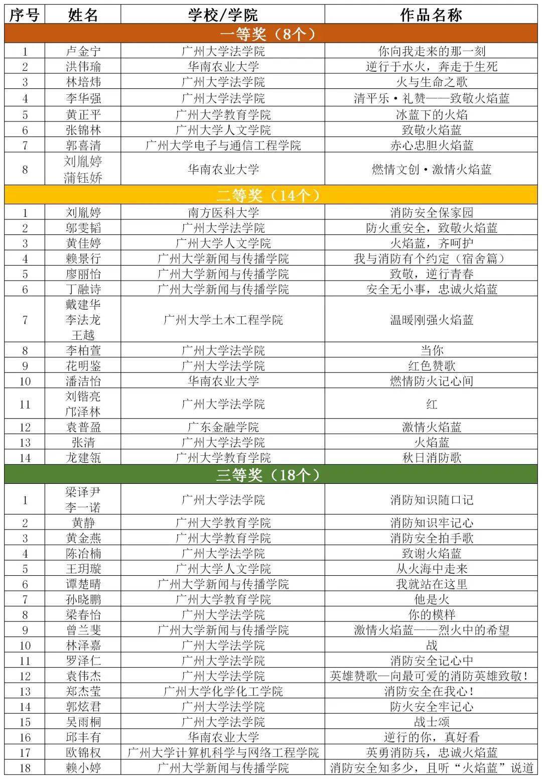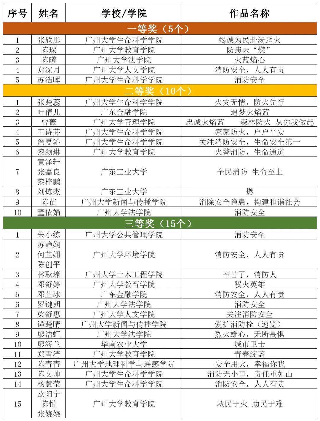 为了宣传消防知识,推进消防文化建设,开发消防文化创意产品,利用文创增强海珠消防宣传文化的感染力、影响力,增强同学们的消防意识,广州大学易班发展中心与广州市海珠区消防救援大队于11月1日联合举办主题为“燃情文创·忠诚火焰蓝”2020年消防文创设计征集活动。截止11月15日,共收到来自12所高校的征文类作品132份,图片类作品81份。经过各专业评委的集中评审,从各类作品中评选出一等奖13个、二等奖24个、三等奖33个,详见以下名单。