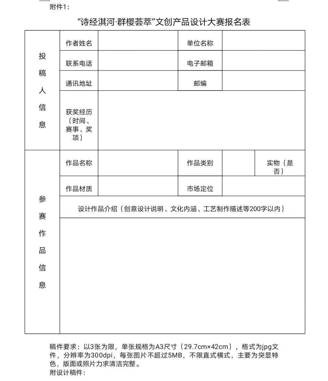2、参赛者必须按照要求提供报名表、电子稿件、承诺书(见附件1、2)。稿件要求:以3张为限,单张规格为A3尺寸(29.7cm×42cm),格式为jpg文件,分辨率为300dpi,每张图片不超过5MB,不限直式横式,主要为突显特色,版面或照片力求清洁完整,作为在线初审及宣传推介使用。
