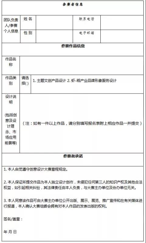 3.参赛作品及报名表于2019年5月30日前将电子版发送至邮箱 qjswhsyfzzx@163.com,邮件主题命名为:潜江龙虾文创大赛+作品名称+参赛者姓名(团队参赛写团队名称);纸质版邮寄至湖北省潜江市园林办事处殷台路5号曹禺大剧院C区潜江市文化事业发展中心。联系人:严春晓,联系电话:0728-6244168,15271204880。