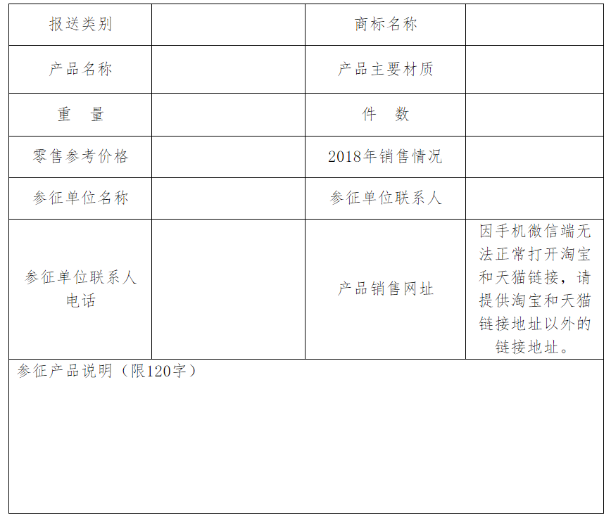 注: 每套参征产品需提供1张全套实物的照片,3张以上主要实物的照片,1张商标注册证照片,如有专利证书或版权注册证书的请提供1张证书照片。照片的文件格式JPG,分辨率不低于300dpi,图片大小1至3Mb。