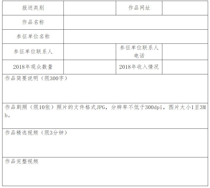 上传每部参征演艺作品时需提供不超过300字的文字介绍,10张剧照,1部3分钟精选视频,1部完整视频。剧照的文件格式JPG,分辨率不低于300dpi,图片大小1至3Mb。如有版权注册证书的请提供1张证书照片。