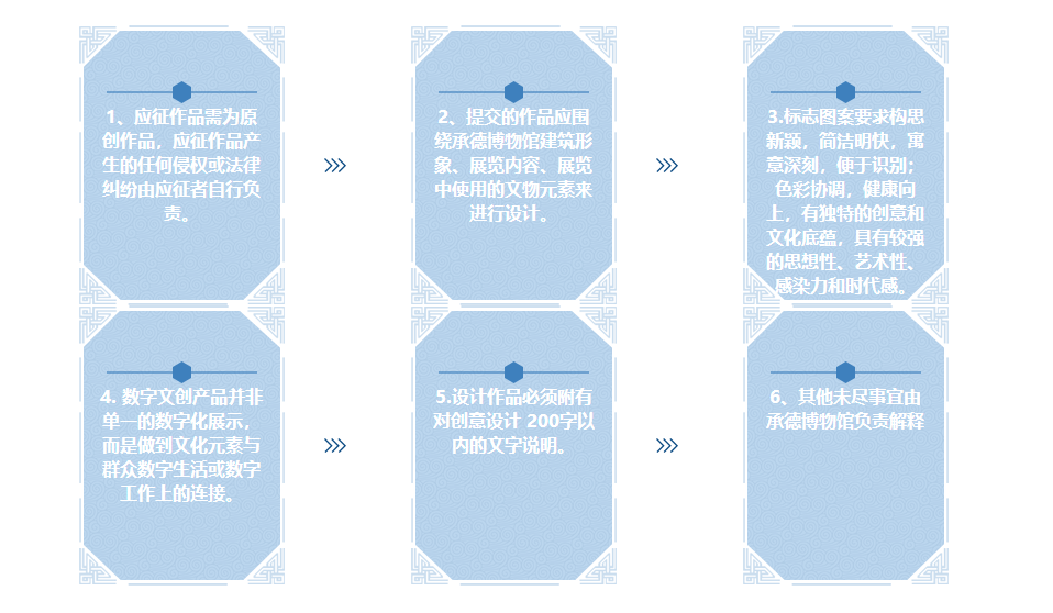 3、作品创作主题符合相关要求认定:依托馆藏资源、形象品牌、陈列展品,围绕承德博物馆建筑形象、展览内容、展览中使用的文物元素来进行设计,征集具有原创性、引领性、有承德特色的精品文创设计作品。不得与当下市场中的产品同质化,不得抄袭和复制。