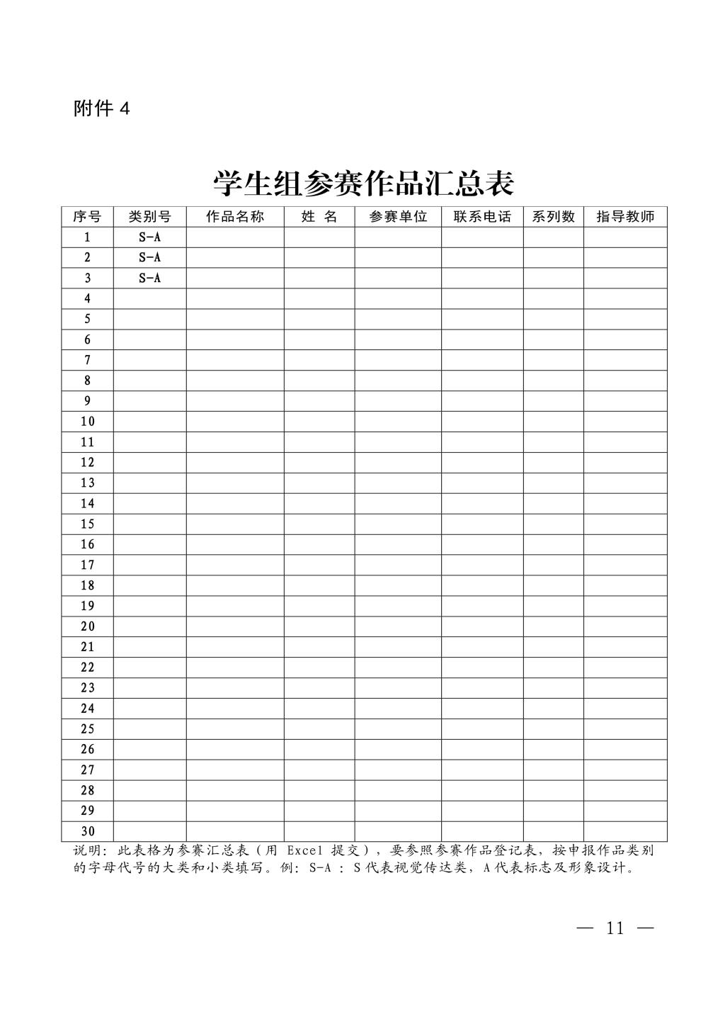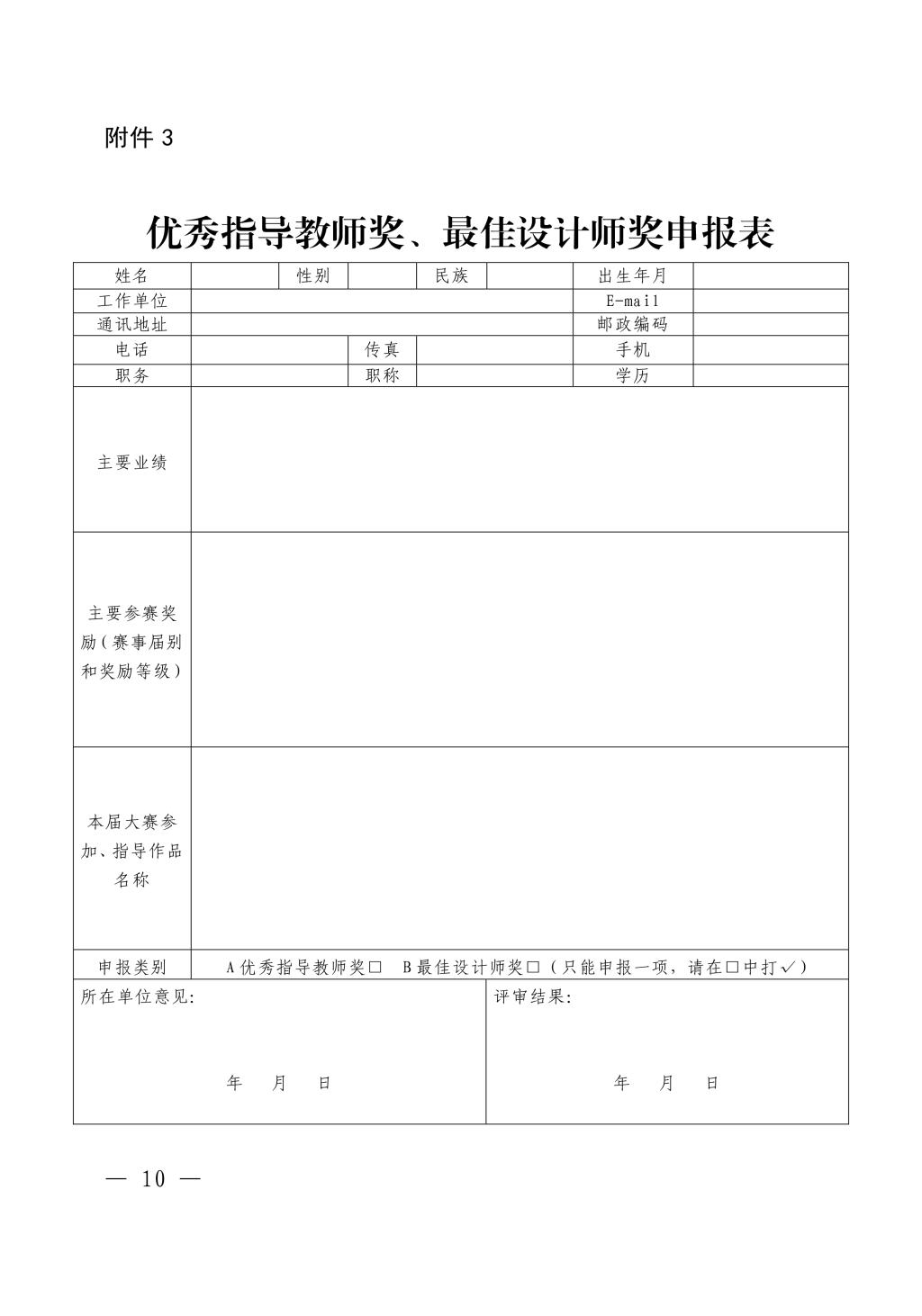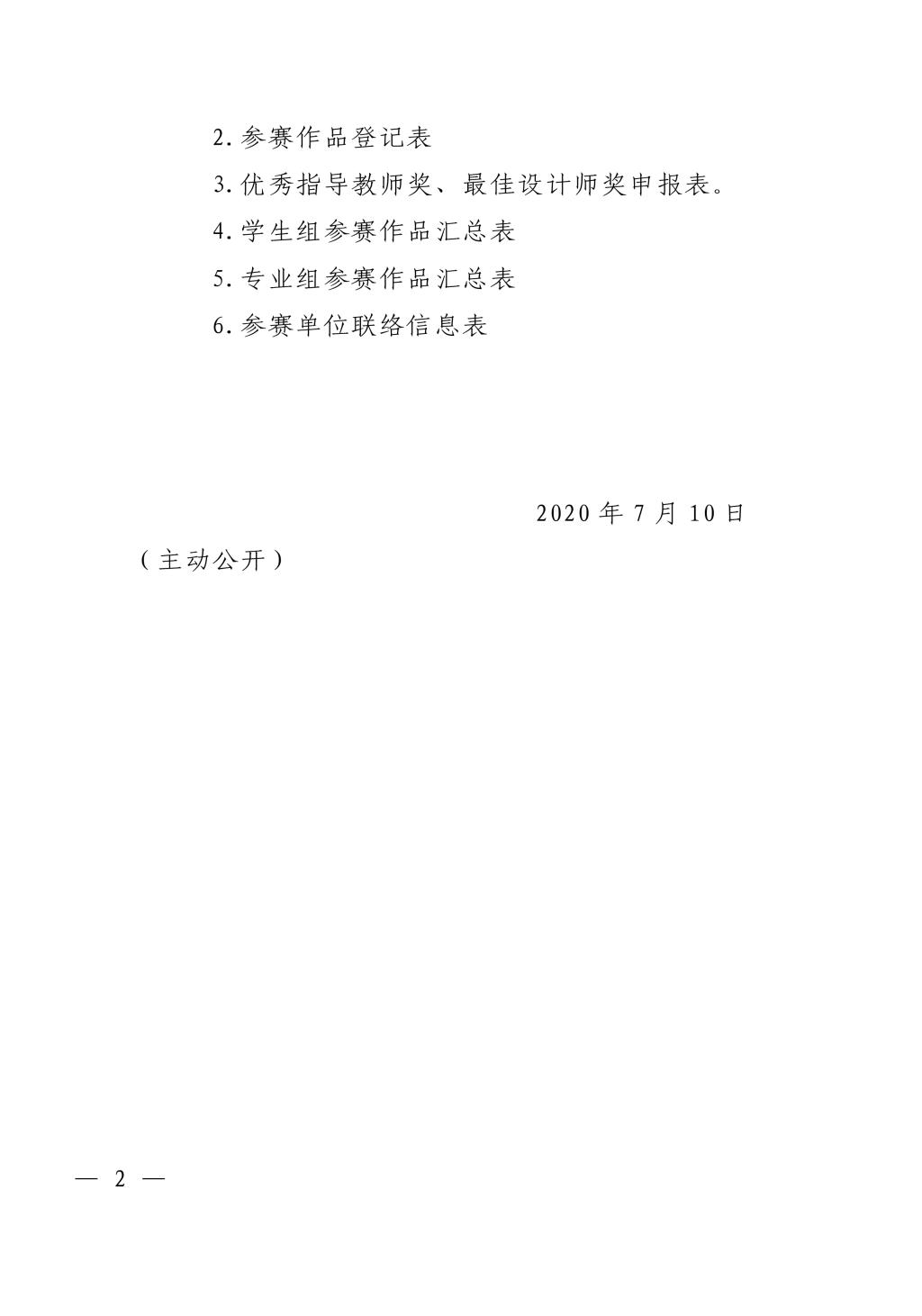 7.参赛单位集中提交电子版,不接受单独申报。参赛单位要严格按照专业组、学生组分组整理参赛文件,按照参赛作品类别整理参赛作品。报送资料要涵盖:参赛作品登记表扫描件(打印后手写签名,加盖公章);参赛作品汇总表 EXCEL 表格(专业组、学生组分开整理);优秀指导教师、最佳设计师申报表扫描件(图片以姓名命名,加盖公章)。