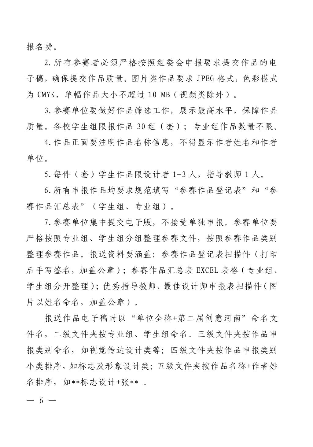 报送作品电子稿时以“单位全称+第二届创意河南”命名文件名,二级文件夹按专业组、学生组命名。三级文件夹按作品申报类别命名,如视觉传达设计类等;四级文件夹按作品申报类别小类排序,如标志及形象设计类;五级文件夹按作品名称+作者姓名排序,如**标志设计+张** 。
