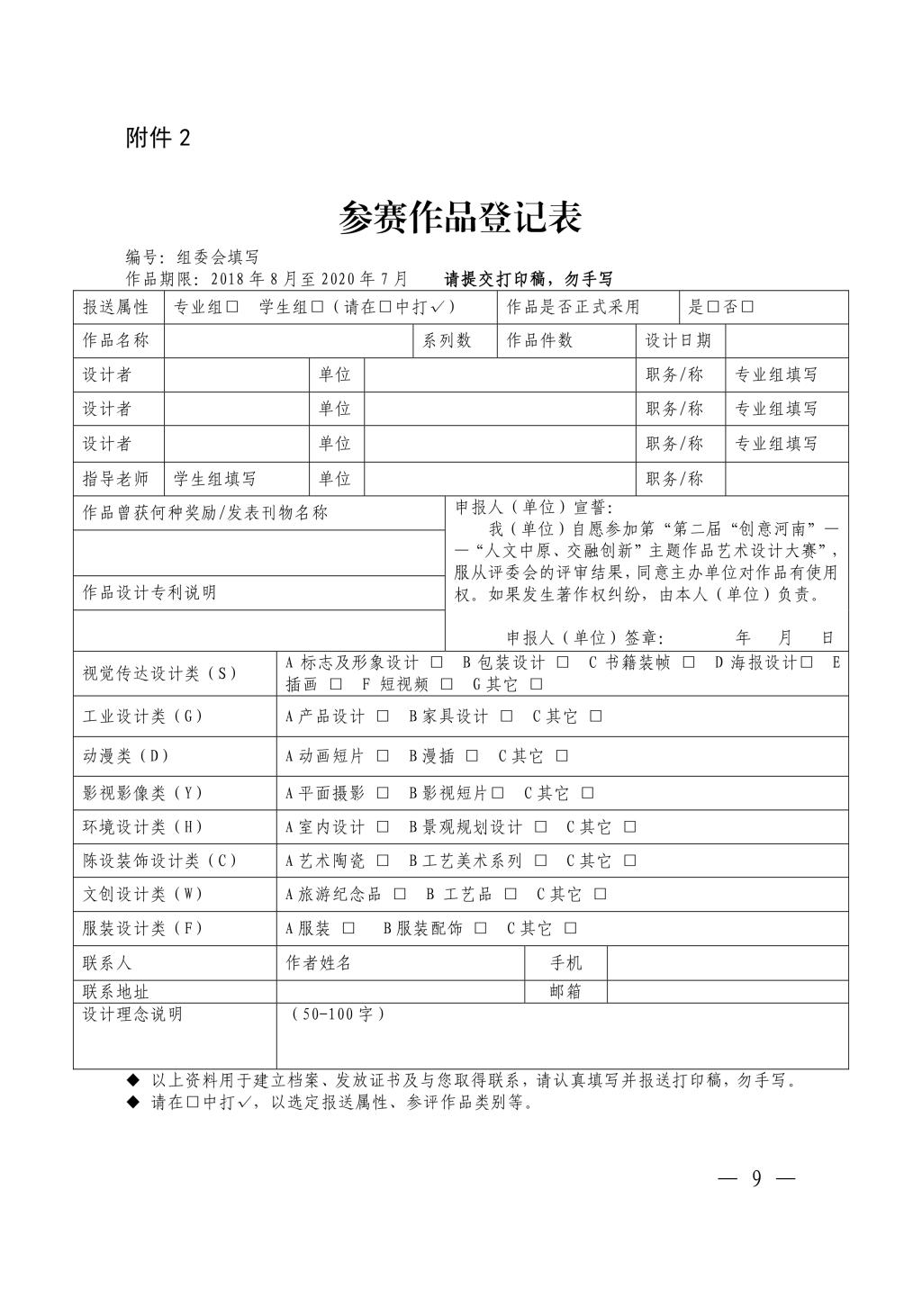 附件2 第二届创意河南 参赛作品登记表(参赛单位用)附件3 第二届创意河南 优秀指导教师奖 最佳设计师奖(参赛单位用)附件4 第二届 创意河南 参赛作品汇总表 学生组(参赛单位用)附件5 第二届 创意河南 参赛作品汇总表 专业组(参赛单位用)附件6 第二届 创意河南 参赛单位联络信息表(参赛单位用)