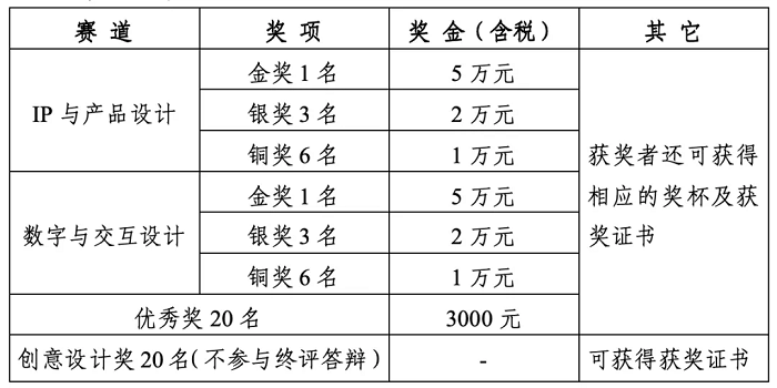 大赛设金奖2名、银奖6名、铜奖12名,优秀奖20名,创意设计奖20名(入围奖、不参与终评答辩)。共60个奖项,奖金合计40万元。