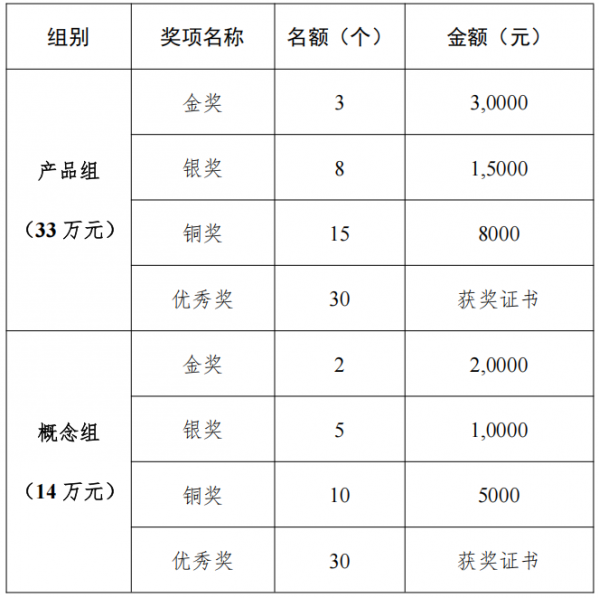 本次大赛奖金合计57万元。其中产品设计组奖金33万元,概念设计组奖金14万元。