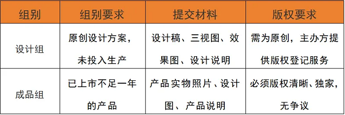 (2)成品组参赛作品应为已上市不足一年的产品,参赛者需提交产品实物照片、设计图以及产品说明,同时必须确保版权清晰独家,无争议。