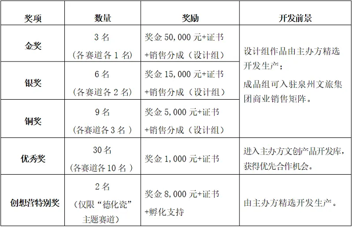 “创想营特别奖”2名,奖金为8000元,并可获得孵化支持和德化瓷创想营学员专属奖项。